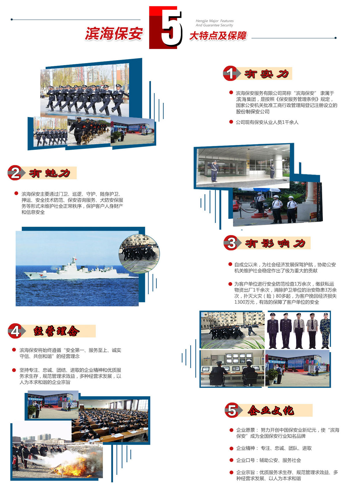 濱海保安主要通過門衛(wèi)、巡邏、守護(hù)、隨身護(hù)衛(wèi)、押運、安全技術(shù)防范、保安咨詢服務(wù)、犬防安保服務(wù)等形式來維護(hù)社會正常秩序,保護(hù)客戶人身財產(chǎn)和信息安全。公司現(xiàn)有保安從業(yè)人員1千余人,客戶單位涵蓋黨政機關(guān)、企事業(yè)單位、金融機構(gòu)、高檔寫字樓、賓館飯店、高檔別墅、高等院校、大型商場、建筑行業(yè)等,現(xiàn)有單位100余家。